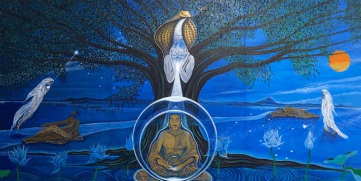 「釈迦悟りの図」逆走シルクロード奉納画作品(メタルアートボード印刷額装付き)