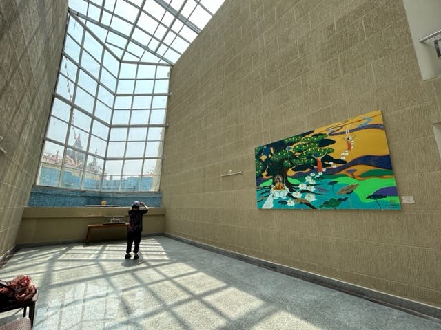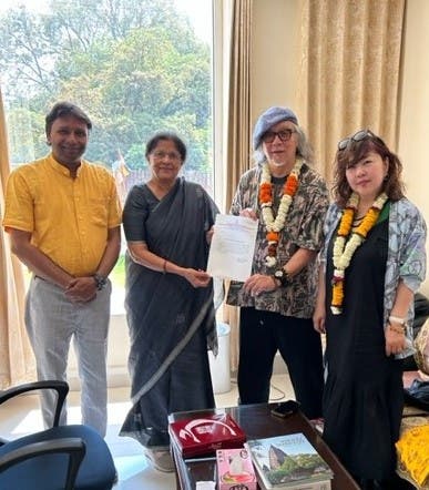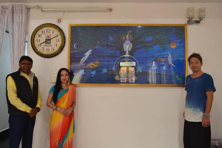 感謝状を頂いたと同時に、現理事長Dr.Mahashweta Maharathu(写真左から2番目)よりミュージアムにもう一枚作画を提供して欲しいと依頼され、この度の3枚目となる「釈迦悟りの杜」奉納画プロジェクトに繋がりました。