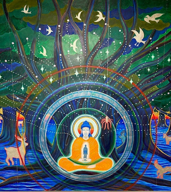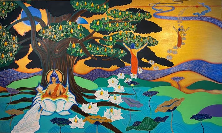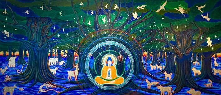 本画は釈迦が見ていた当時の菩提樹の森の風景です。