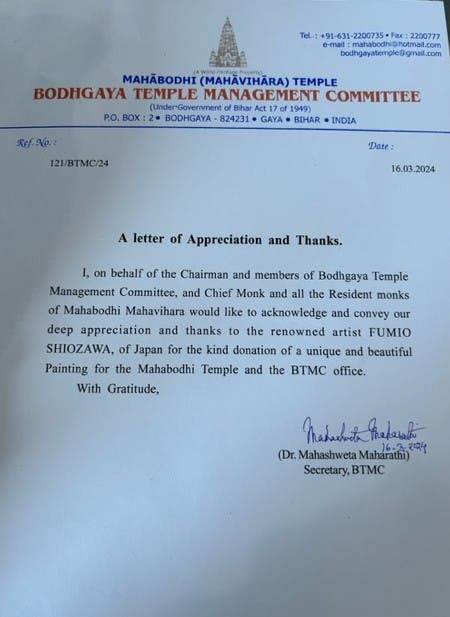 2023年に建設されたミュージアムに納めた「釈迦宇宙巡礼図」ではマハーボデイ寺院より感謝状を頂きました。(下記写真)