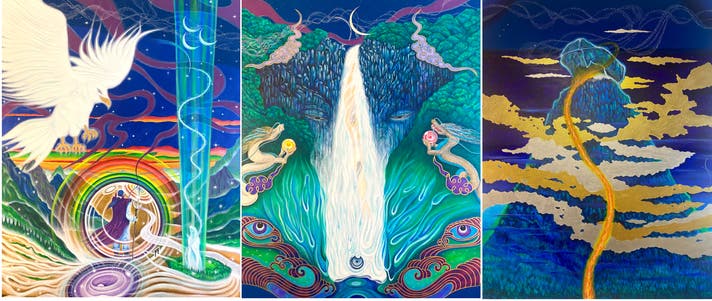 身体が銀河で出来ている青龍が口から吐き出しているのは新しい地球。大宇宙を青龍で表現し、いのちの大切さを描いています。
