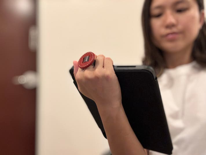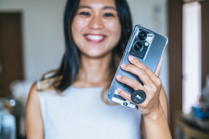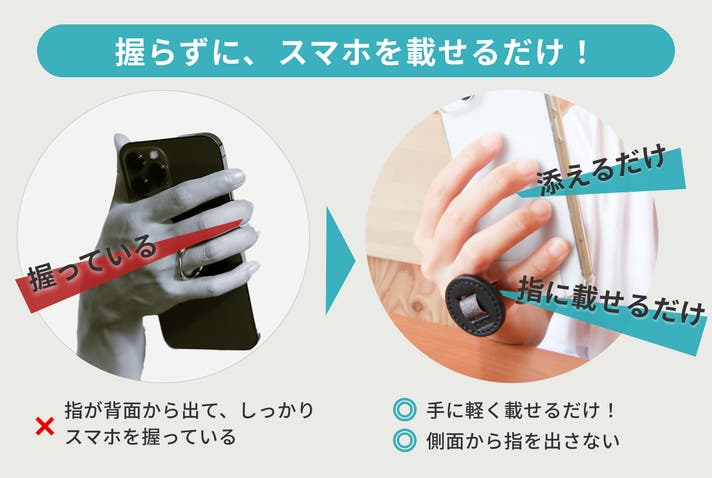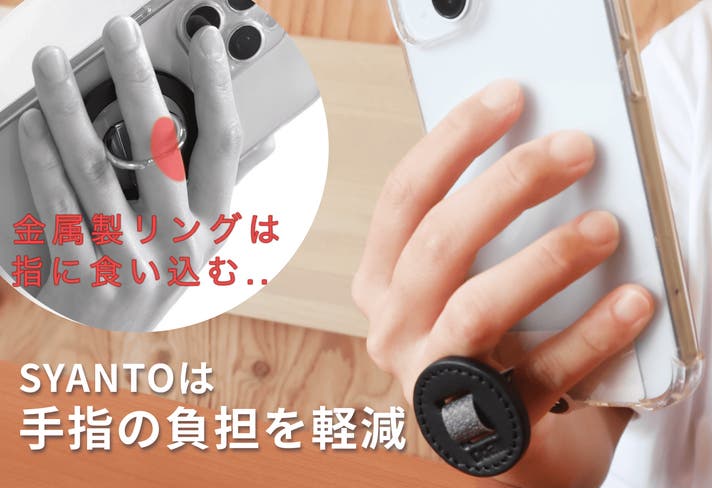 SYANTOは「スマホを握らない」、柔らかいシートで指を包み込むことで、手指への負担を軽減します。