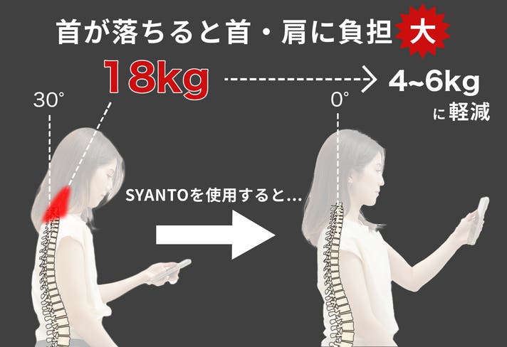 SYANTO独自の底面支持構造により縦バランスでスマホを支えるため、スマホが自然と垂直になりやすくなります。それにより首が落ちづらくなり、姿勢が起きることが期待できます。