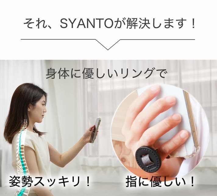 従来のスマホリングやスマホスタンドが背面を支点とするなか、「SYANTO」は“底面”が支点となることにより、「スマホが軽く感じる」、「姿勢が起きる」、「背面がフリーになる」といった効果が期待できます。