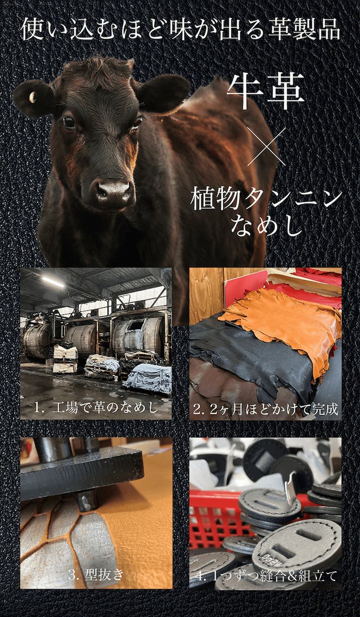 革の加工と組み立ては革職人により、一つ一つ手作業で制作します。植物タンニンなめしで製作するため、化学薬品を使用した大量生産品に比べて、動物由来の革の表情が現れやすく、使い込むほど手に馴染みやすくなります。