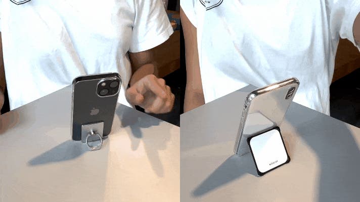従来のスマホリング型スマホスタンドは、両手で操作が必要。