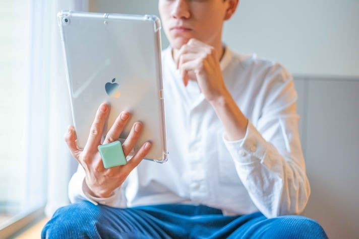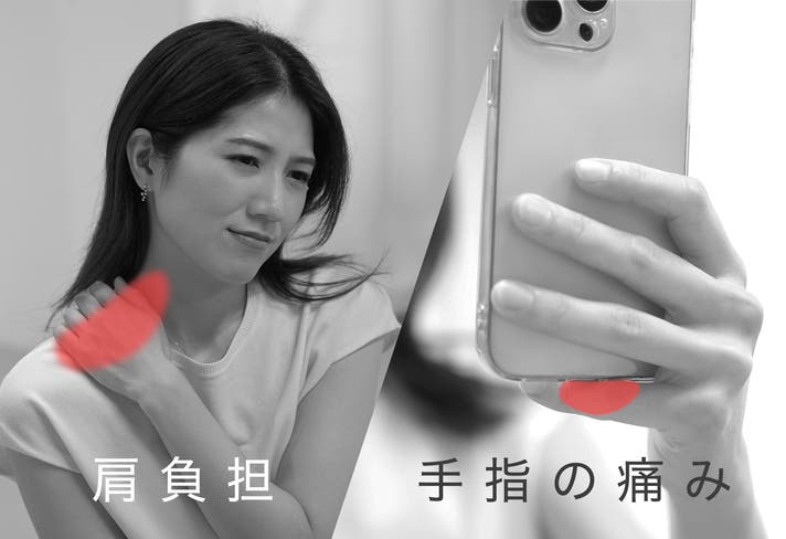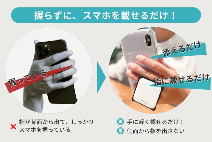 SYANTOは「スマホを握らない」、柔らかいシートで指を包み込むことで、手指への負担を軽減します。