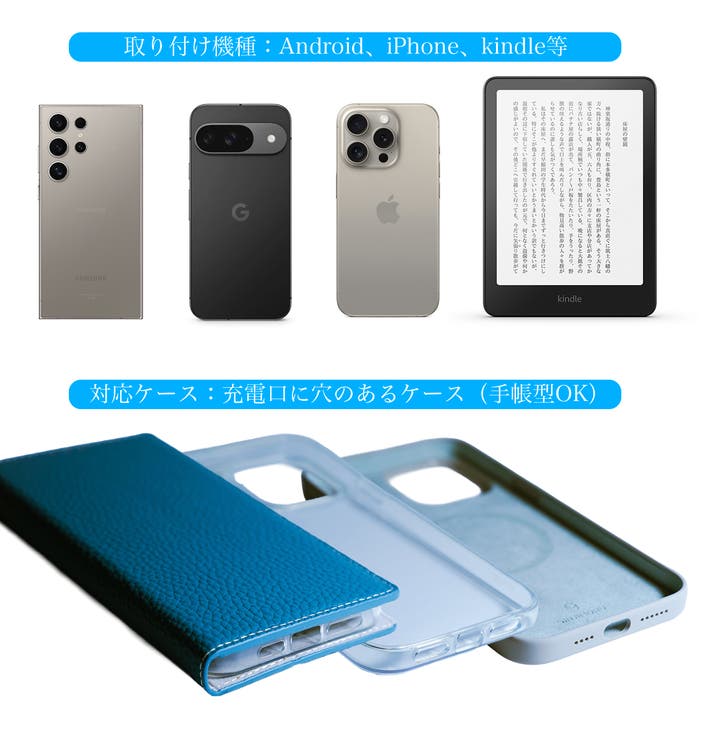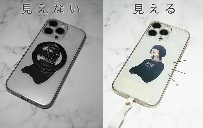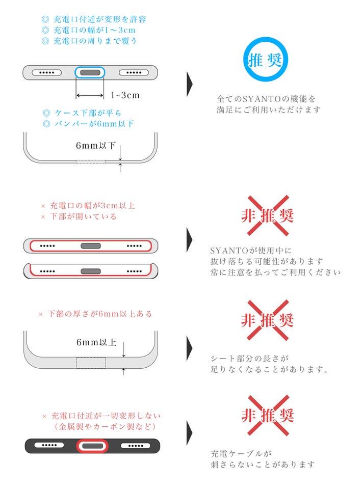 ※カーボン製や金属製のケースで、変形を許容せずスマホとの密着度が非常に高いものは、ケースが浮くことがございます。厚紙などを入れてみて実験いただくと確実かと存じます。