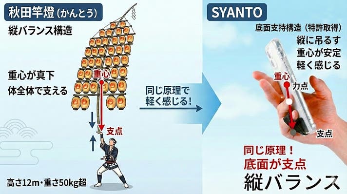 従来のスマホリングやスマホスタンドが背面を支点とするなか、「SYANTO」は“底面”が支点となることにより、「スマホが軽く感じる」、「姿勢が起きる」、「背面がフリーになる」といった効果が期待できます。