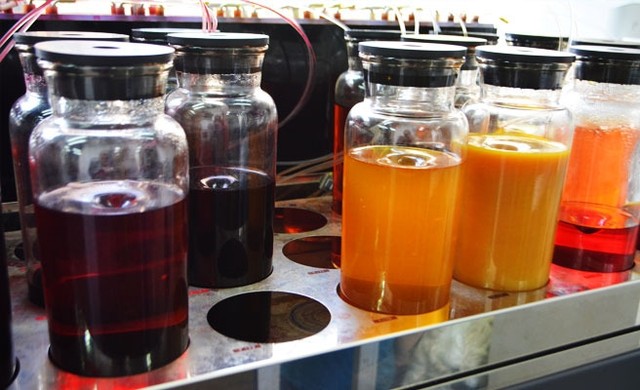 ▲ 大量の糸や生地を染める前に試色を出す為の「ビーカー」という色出しの作業。