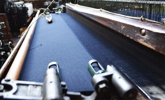 【2. 毛織】 出来上がった糸を組織通り(平織り、綾織り、朱子織など)に織機で生地にする工程。