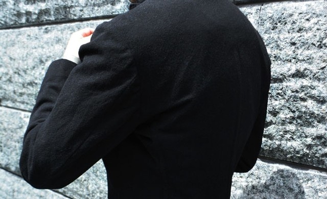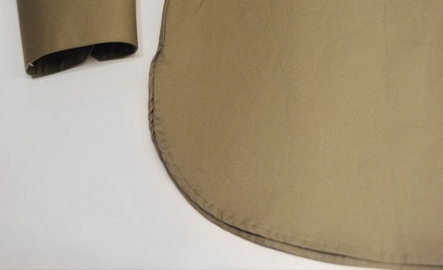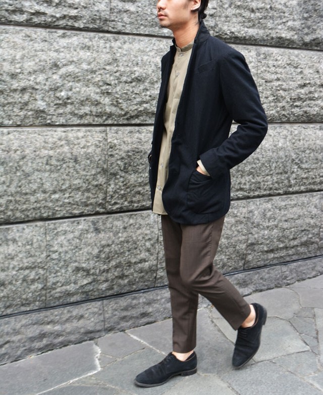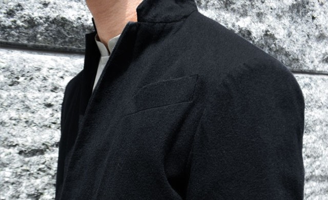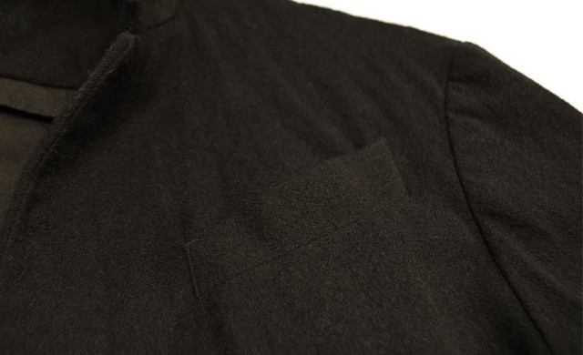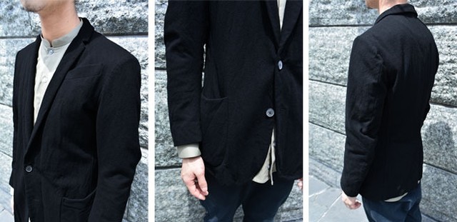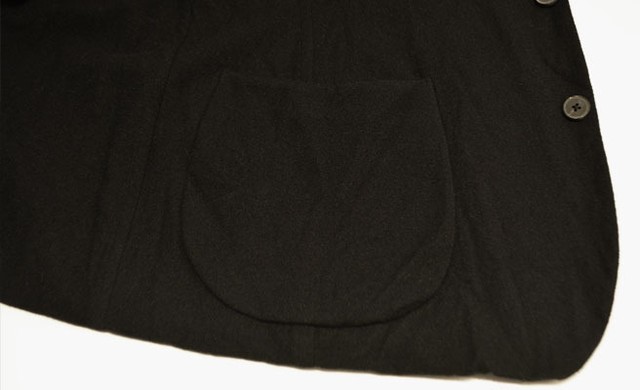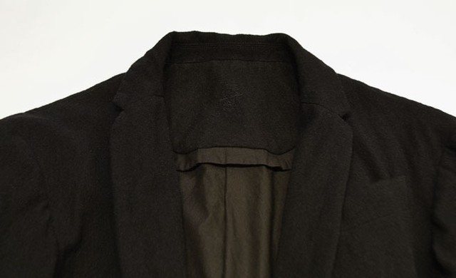 本来、肩パッドや芯を使用する理由は「見栄え・形状の安定・縫製の都合」などですが、今回の強縮絨ジャケットでは生地の柔らかさや風合いを活かす為 芯貼り・パッド入れをしていません。カジュアルに着られるテーラードです。