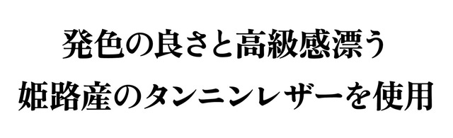使用している革は皮革産業で盛んな姫路のタンナーより生産される、言わずと知れた『姫路レザー』。よく比較される『栃木レザー』のようにエイジング(経年変化)する素材ですが、栃木レザーに比べると多少エイジングタイムが長く、新品時の風合いや発色の良さが長持ちする利点がございます。