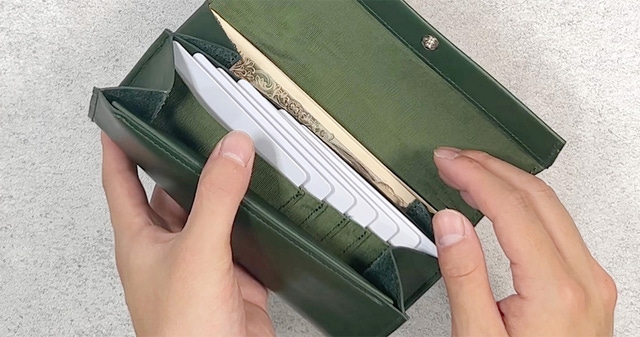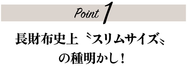 - 特殊構造で長財布史上最小級サイズを目指しました。洗練感のあるスリムなサイズが心地良い。