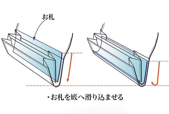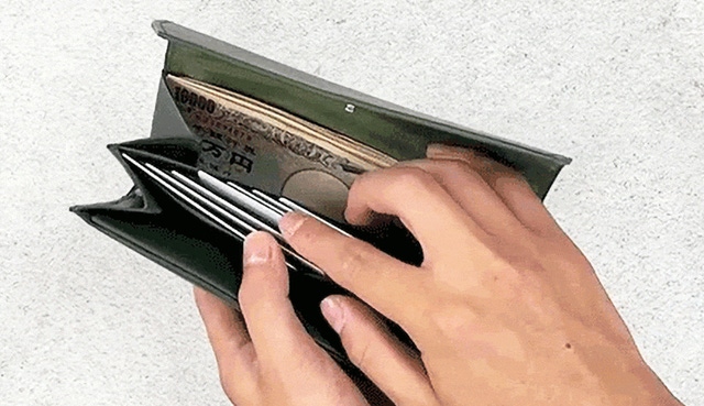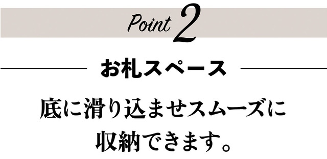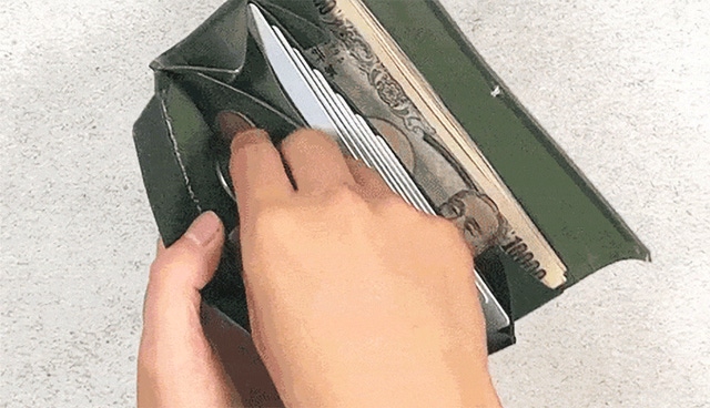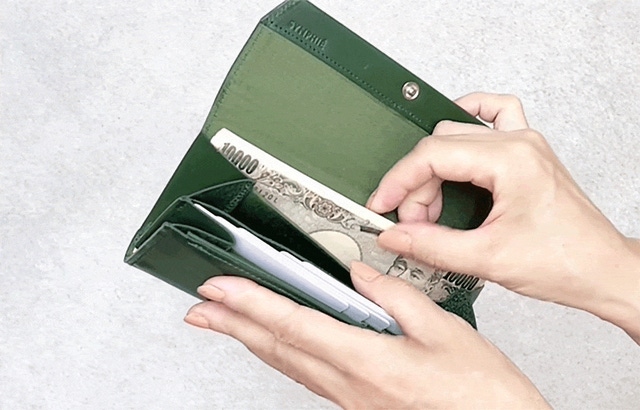 特殊な構造でお札を底の隙間に滑らせて入れます。お札を少ししゃがませる感じで入れることでお財布自体のサイズをよりスリムにすることが出来ました。
