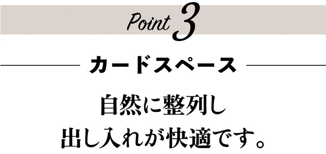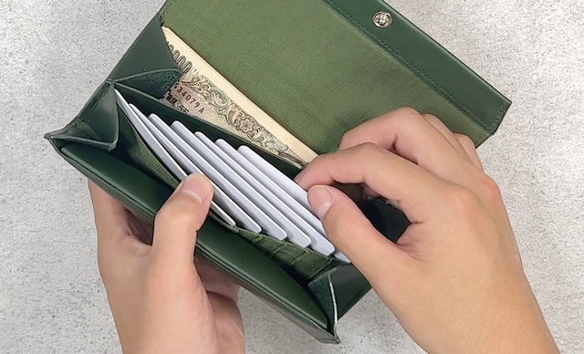 必要なカードを厳選して持つのが現代(いま)のお財布です。とは言え必要な収納容量(7枚)はしっかり確保し、自然に美しく整列します。