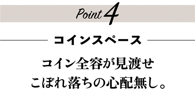 また、財布を開けた時、ジャラジャラと小銭が見えないのもすっきりしていて心地良いです。