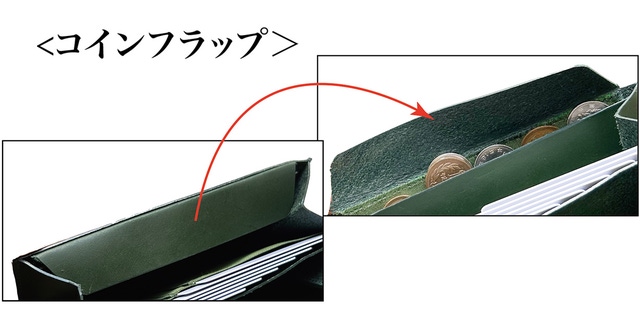 小銭入れにはフラップがついております。形状記憶されていて自然に折り込まれ、開閉が簡単です。お札やカードの出し入れの時に逆さまにしても小銭がこぼれ落ちる心配はありません。