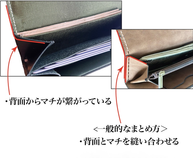横幅に関して、一般的な横面のまとめ方は、背面とマチが独立したパーツを縫い合わせるので、縫い目がある分お札の幅よりかなり広く幅を設定しなければいけません。こちらは、背面とマチを繋げてお札を包み込むような設計です。