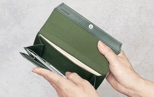 そこで長財布の使い勝手の良さを保ちつつより小さくを目指しました。既存の構造ではお札を折らない限りお札より小さくすることは物理的に無理です。