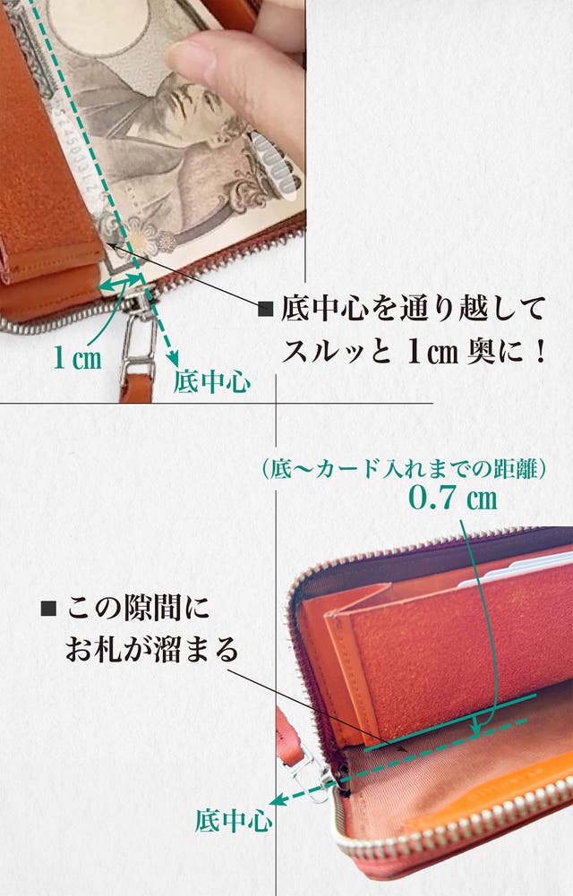 お財布の底部分に隙間を作り、お札を底中心より奥に滑り込ませるだけです。簡単なマジックのようですね!