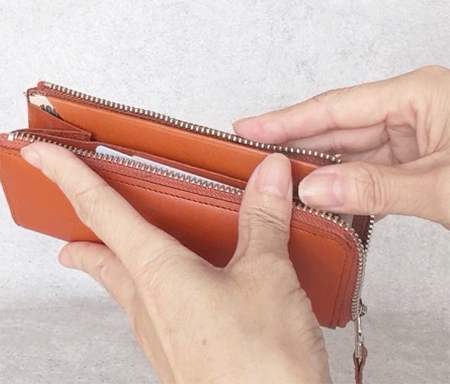 L字ファスナー財布は、使い勝手が良く人気が高いですが、引き手が財布の上部にあるため、バッグやポケットの中で擦れて勝手に開いてしまうことがありますよね。