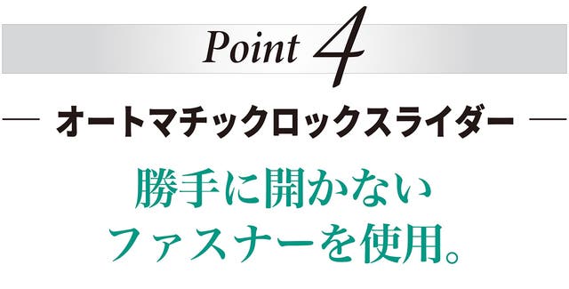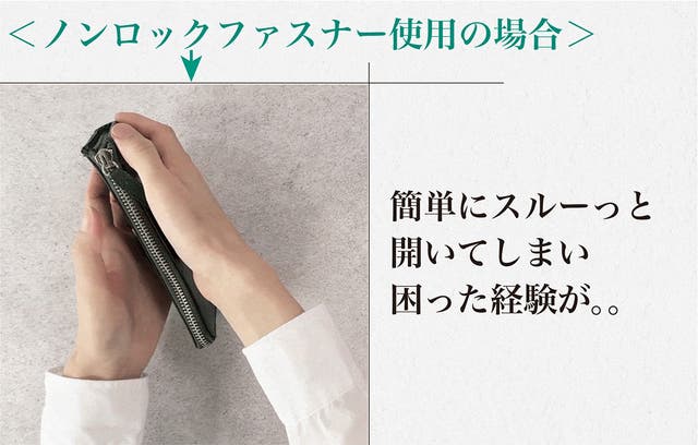 その問題を解決するのが、「オートマチックロックスライダー」を使ったファスナーを使用することで勝手に開くのを防ぎ、財布の中身が保たれます。