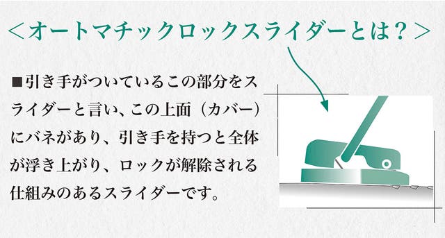 使い方も簡単です。閉める時に引手から手を離すとスライダーに自動的にロックがかかり、開ける時は、引手を引っ張ることによって外れ、スムーズに開け閉めができます。