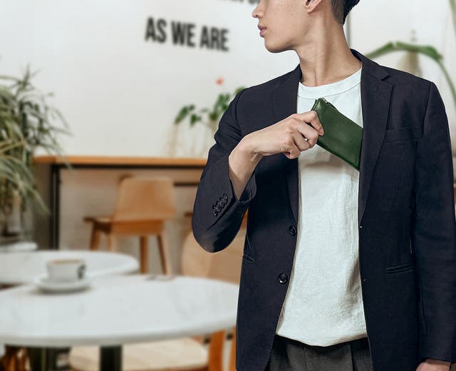 ビジネスシーンでランチの時もお財布は身近に持っていたいもの。スーツの胸ポケットにシルエットを崩すことなく嵩張らずに入ります。