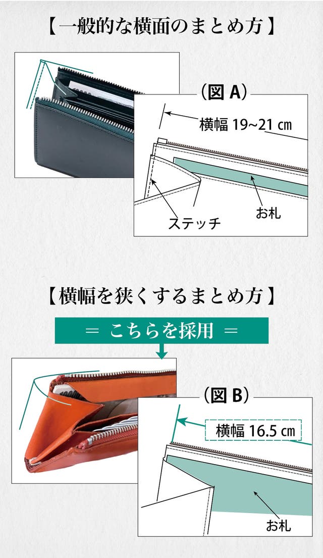 そこで長財布の使い勝手の良さを保ちつつより小さくを目指しました。既存の構造ではお札を折らない限りお札より小さくすることは物理的に無理です。