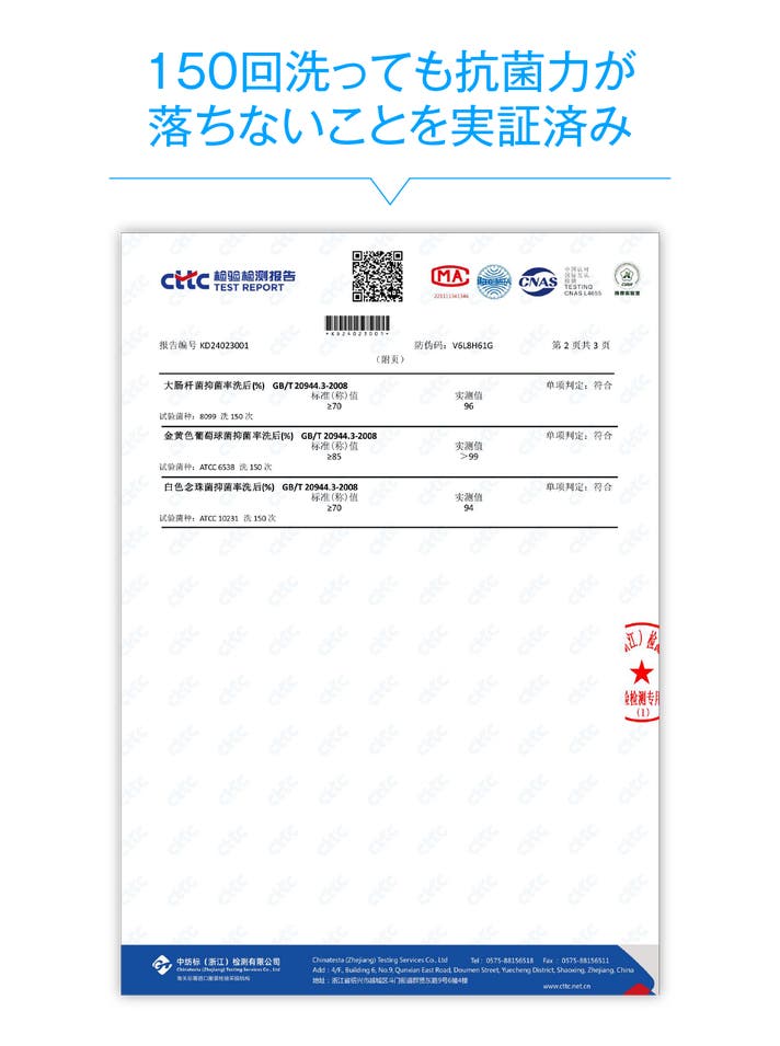 A1. メーカー独自の光触媒技術により、洗濯しても抗菌・消臭効果が長期間持続します。通常の抗菌加工とは異なり、繊維自体に作用するため、150回以上の洗濯後も高い効果を維持します。