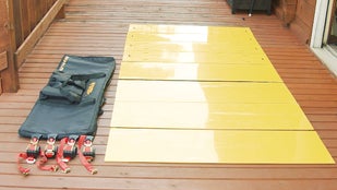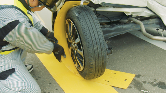 スケーター(板)と、ラチェット(特注留め金具)を使ってタイヤを固定して、補助板の上を滑らせることで、今までレッカー車で数人がかりでしか動かせなかった事故車輌や悪路でも1人で車を移動できるようになります。