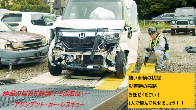 1人で1台積み積載車に事故車でも、悪路でもレッカー屋さんに頼らず積む事が出来ます。