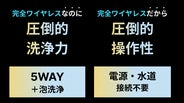 - 完全ワイヤレスなのに圧倒的洗浄力。5WAY+泡洗浄。2.5Mpaの高水圧。
