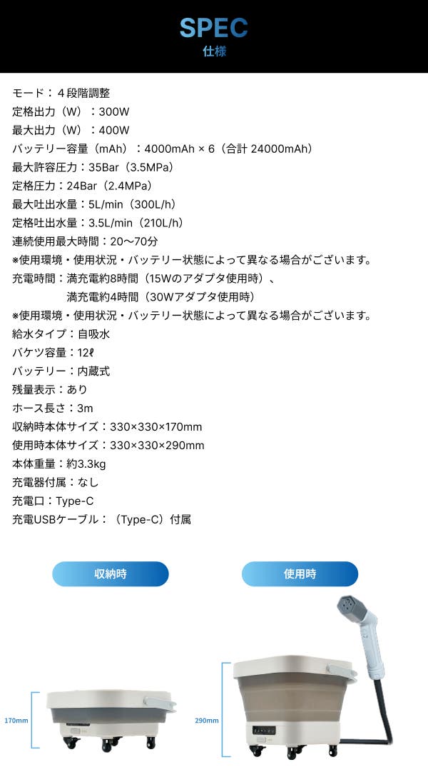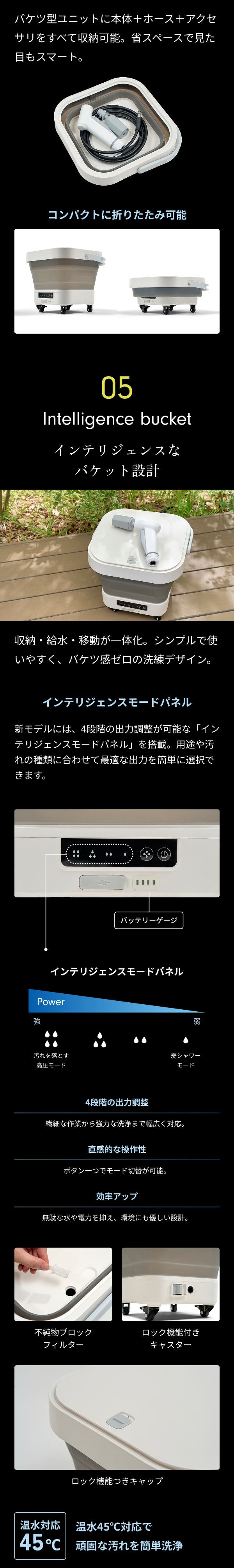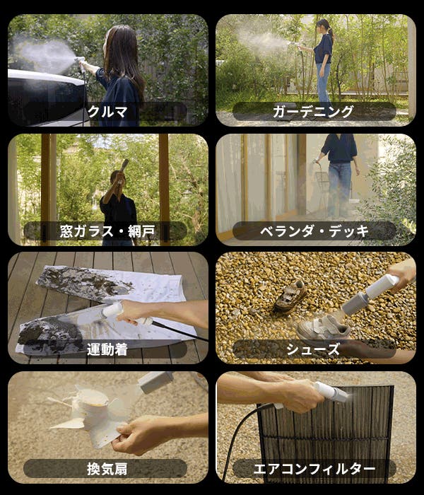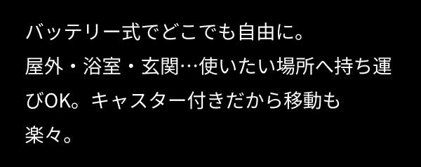 - バッテリー式でどこでも自由に。 屋外・浴室・玄関…使いたい場所へ持ち運びOK。