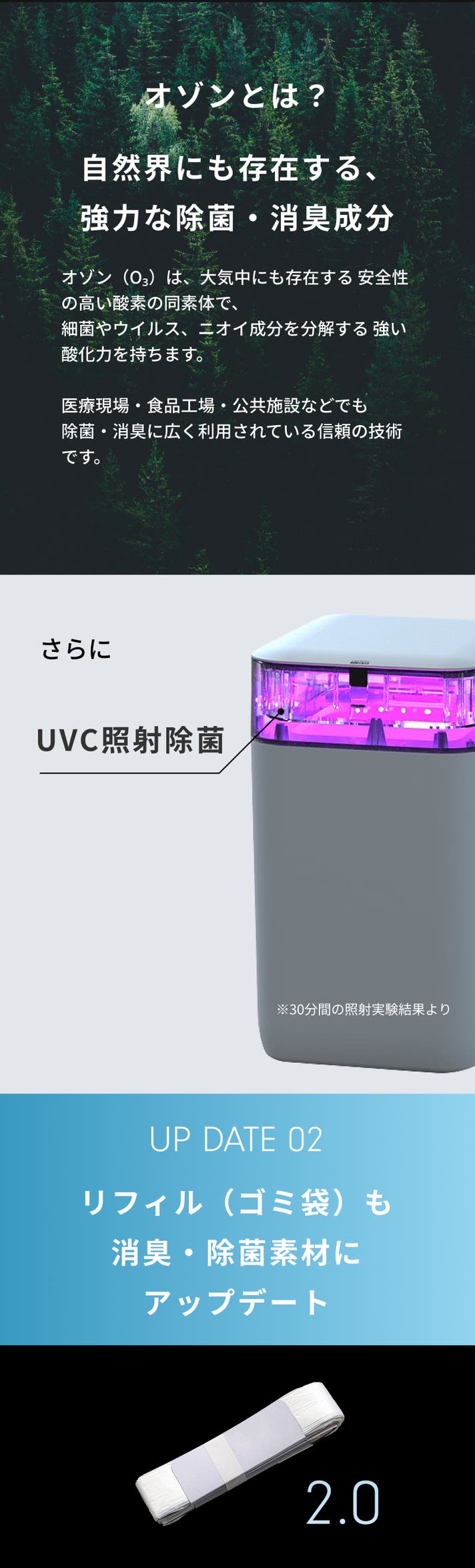 - 【さらに進化】UVCライトに加えてオゾン除菌消臭を新搭載!専用ゴミ袋にも消臭機能をプラス。