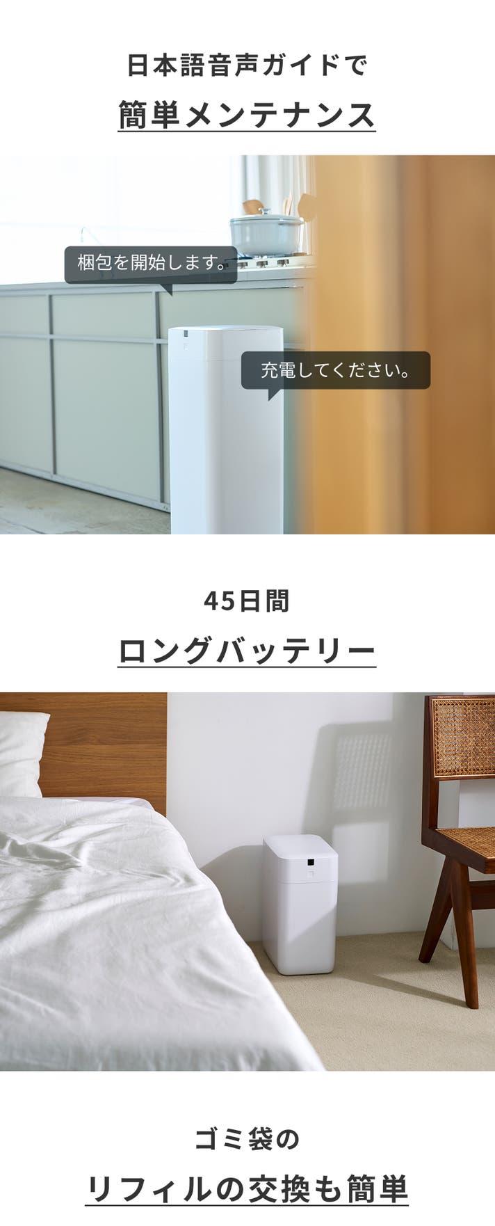 - 【ゴミ袋を自動充填】面倒なゴミ袋のセットも手放しで完全自動で充填、手間ゼロへ!
