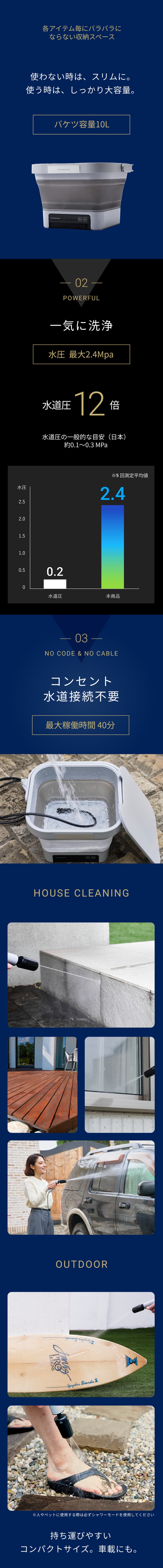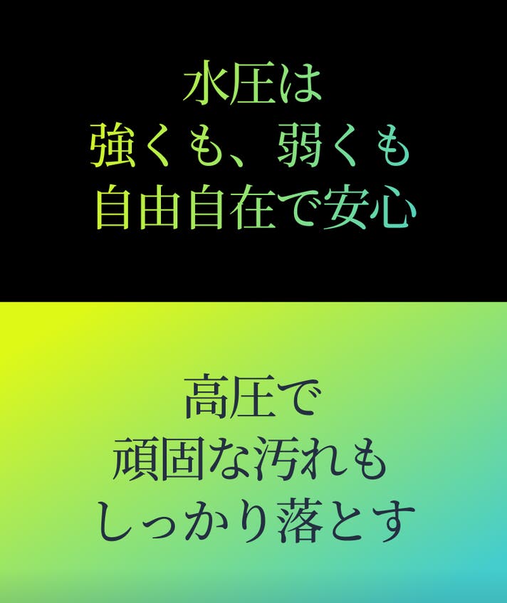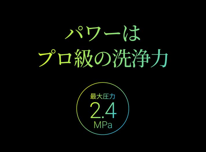 - プロ級の洗浄力、水圧自在で強くも弱くも思いのまま
