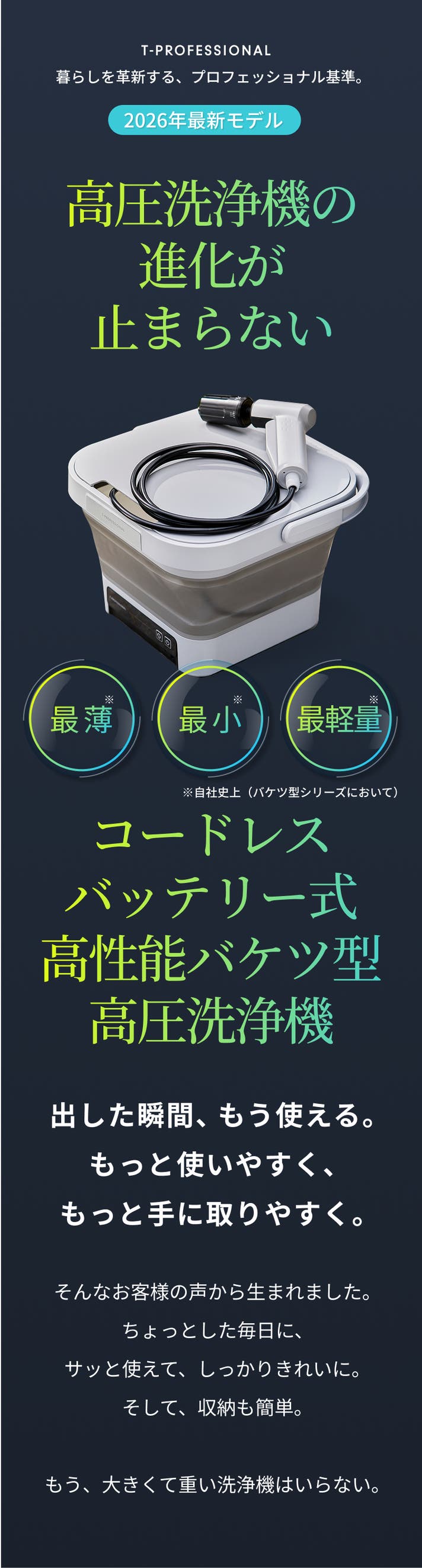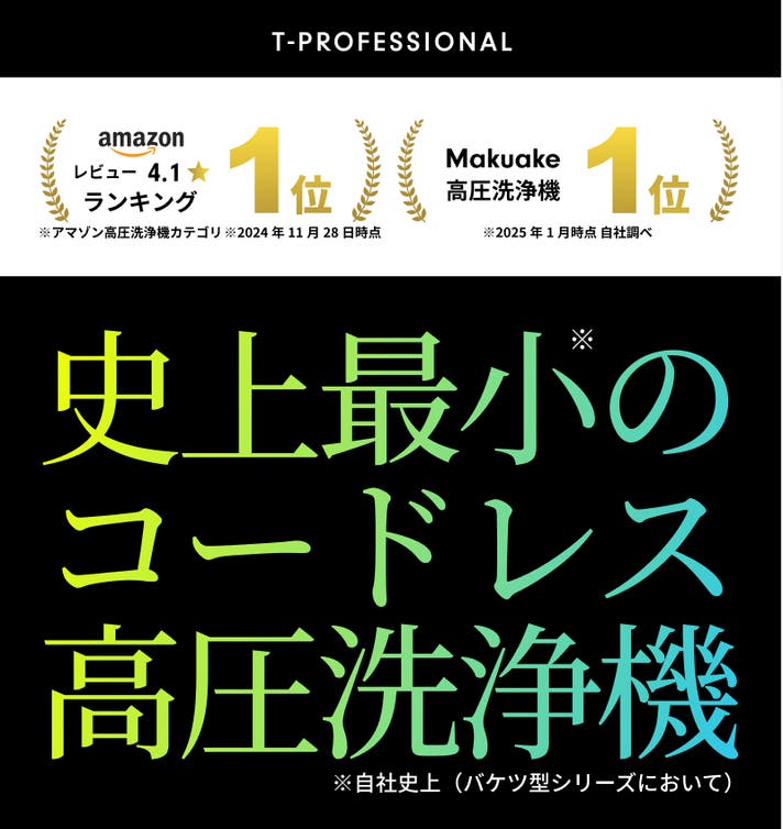 「Makuake(マクアケ)」は、実行者の想いを応援購入によって実現するアタラシイものやサービスのプラットフォームです。このページは、 プロダクトカテゴリの 「圧倒的洗浄力×最薄・最小・最軽量モデル※、進化するコードレス高圧洗浄機※自社史上」プロジェクト詳細ページです。
