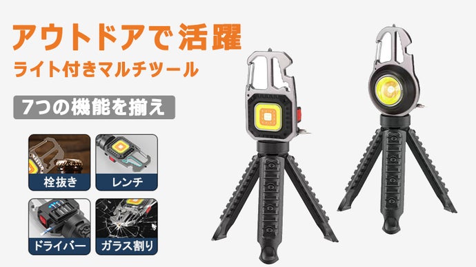 キャンプで便利な栓抜きと投光ライトをはじめ、DIYで活躍するドライバーなど、いろいろな機能を備えています。