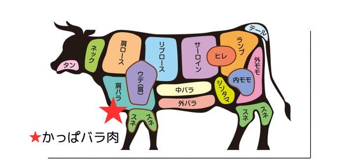 かっぱ肉はどこの部位?、前腹の皮と脂身の間にある赤いスジの事です。 バラ肉の一番外側の部位にあり牛 1頭から取れる量はごくわずかで大変希少な部位です。