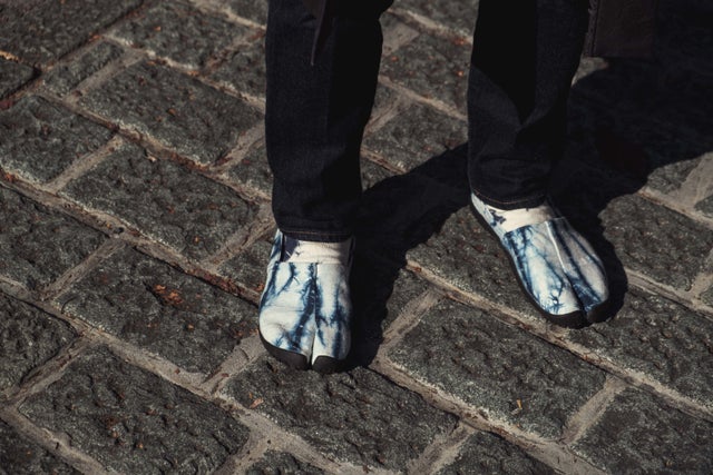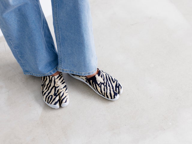 山田:第一印象で見るとゼブラ模様の足袋ですが、抜け色やコントラストの微妙な変化もあり、プリントでは出せない色に仕上がっています。藍が多めの足袋は男性を意識して、少な目は女性を意識しています。藍染めのデニム生地は履くにつれ徐々に色落ちしていきますので、絞り模様と色落ちした色が重なり合い、履き方によって様々な個性のある足袋に仕上がっていきます。