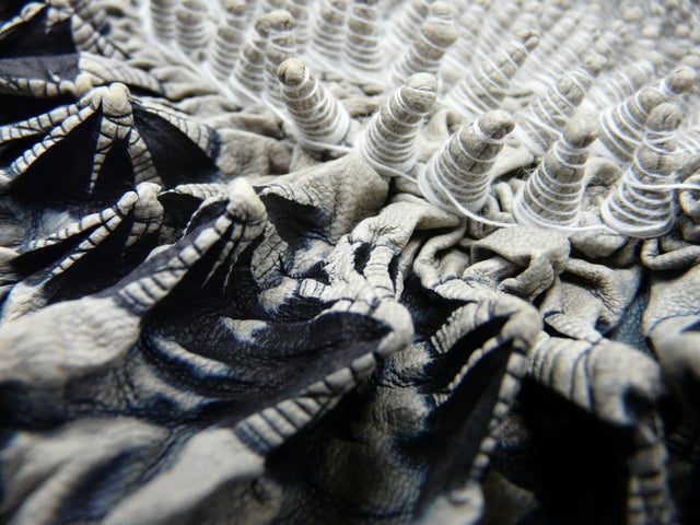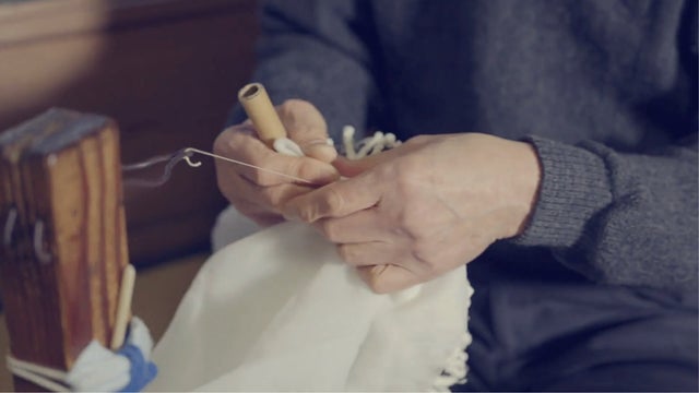 下絵で模様の輪郭を描き、輪郭に沿って糸を等間隔で縫っていきます。根元から先端へ糸を巻き上げていく括り(絞り)は模様の表現が決まる大切な工程です。