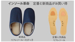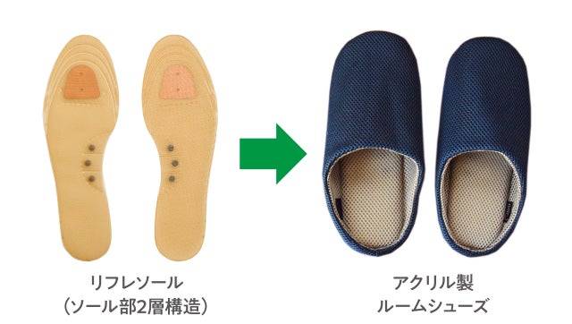 「リフレソール~たびっ子」は、定番人気商品「リフレソール」のソール部を2層構造に改造してルームシューズに内蔵されており、飛行機搭乗時や新幹線・長時間列車乗車時に靴を脱ぎこの「リフレソール~たびっ子」に履き替え、リカバリー用ルームシューズとして使用することを想定しています。
