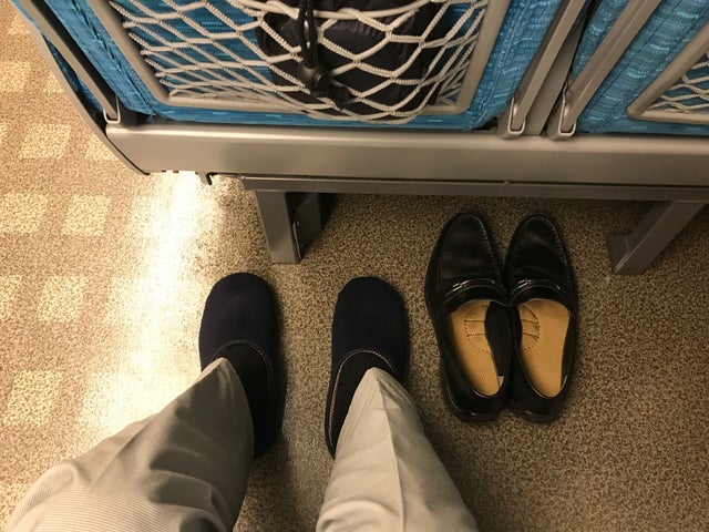 「リフレソール~たびっ子」は、出張や旅行に行く際、専用のポーチに入れて携行し、機内搭乗時や新幹線などに乗車時にシューズを脱いで履き替えて使用します。