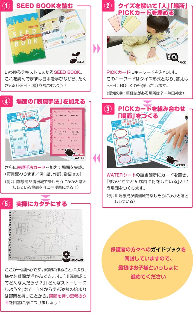 日本のあらゆる地域への疑似旅行をしながら学びを深めるコンテンツが毎月届きます。「SEED BOOK」という本をもとに、様々なキャラクターたちが楽しく広く、学ぶきっかけ作りをしてくれます。