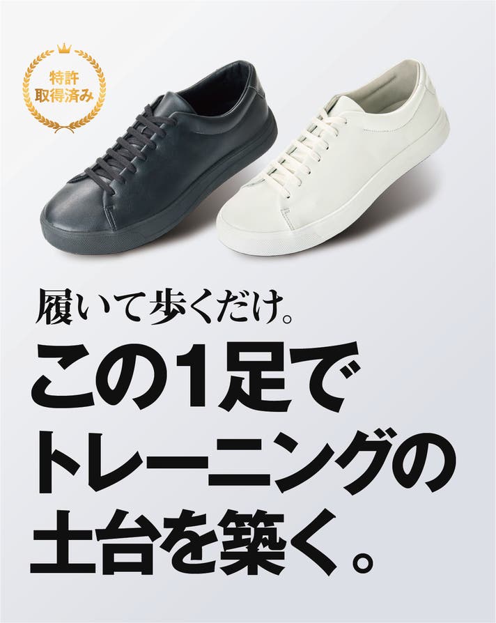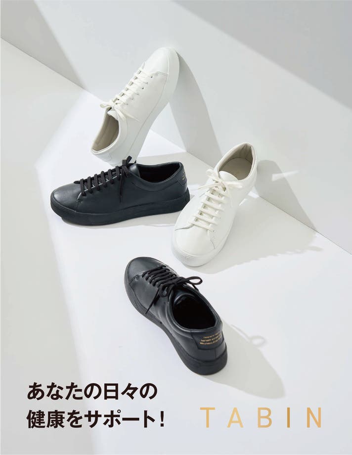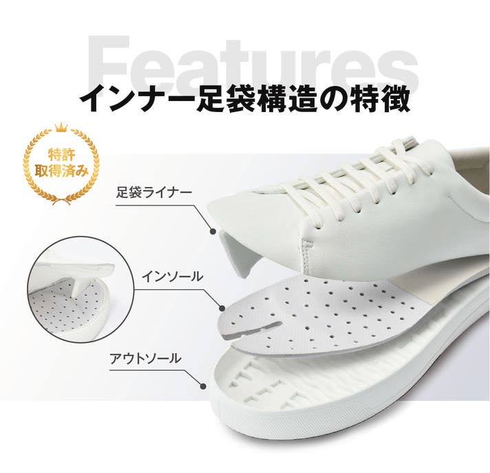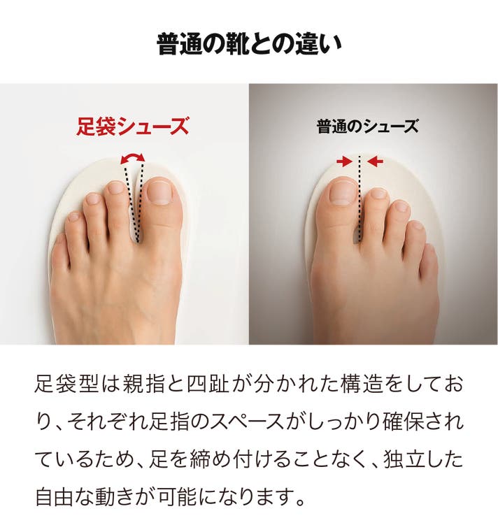 このシューズは、見た目は一般的な合皮スニーカーでありながら、内部に足袋構造を採用しています。これにより、足指を独立して使うことができ、歩行やバランスに重要な役割を果たします。また、足や姿勢などへの健康効果が得られることが科学的に支持されています。