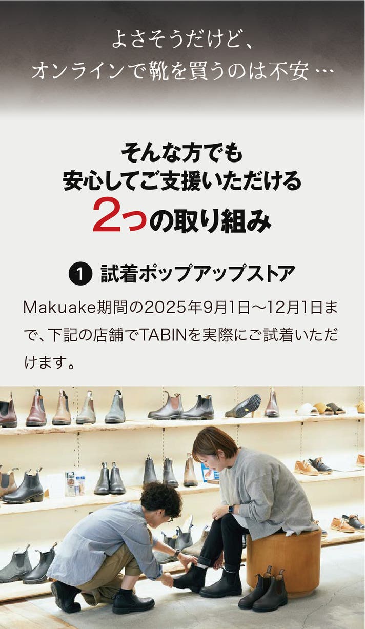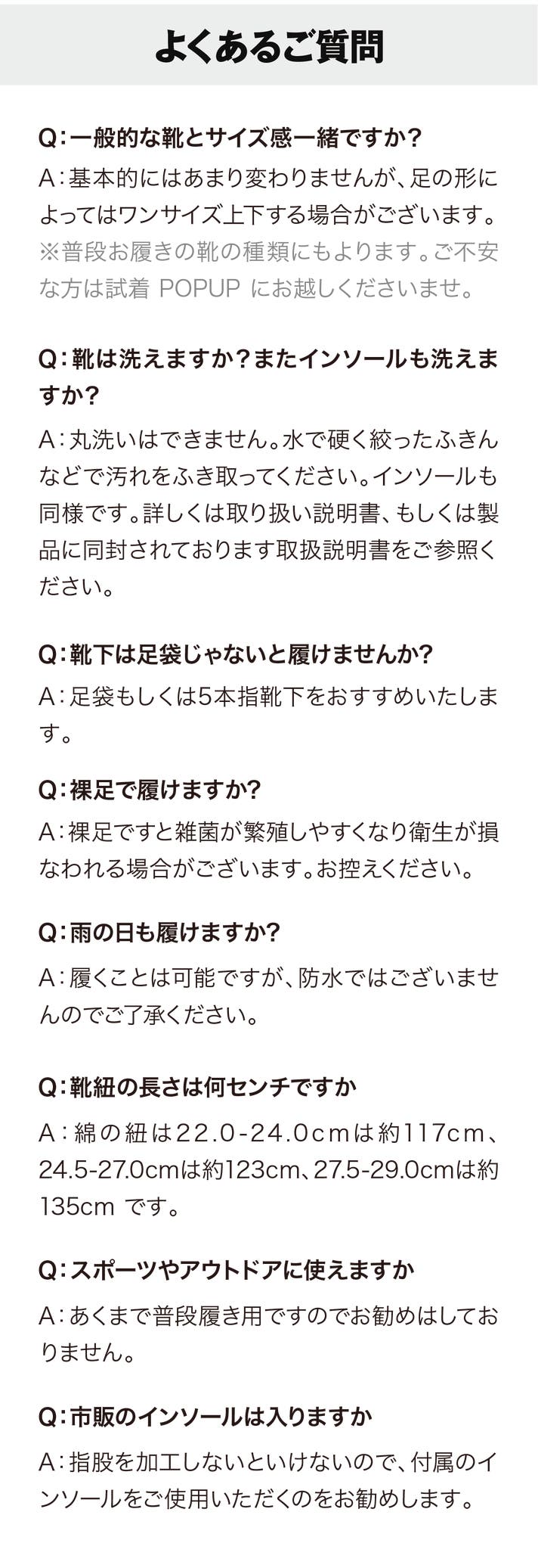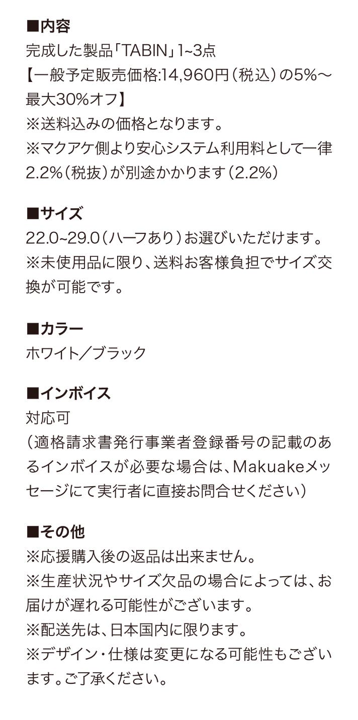 ■本プロジェクトの商品は、12月上旬以降随時発送予定です。 ■ご注文状況、使用部材の供給状況、製造工程上の都合等により出荷時期が遅れる場合があります。その際、活動レポートにてご報告させていただきます。 ■開発中の製品につきましては、デザイン・仕様が一部変更になる可能性もございます。 ■本プロジェクトを通して想定を上回る皆様から応援購入を頂き、現在進めている環境から量産体制を更に整えることができた場合、正規販売価格が販売予定価格より下がる可能性もございます。 ■モニター、携帯機種によって表示される写真は、実際の商品の色と異なって見える場合がありますので、ご了承ください。 ■使用感などに関しては、感じ方に個人差が予想される製品でございます。使用感等に関する返品・返金はお受けいたしかねます。 ■弊社では他社の類似品に関してのお問い合わせには対応できませんので、ご了承ください。模造品にご注意ください。 ■本文中に記載させていただいたスケジュールはあくまでプロジェクト公開時点の予定です。 応援購入の性質上、配送遅延のおそれがございます。 ■原則として、配送遅延に伴う応援購入のキャンセルはできませんが、リターン配送予定月から2ヵ月を超えた場合には、希望者に限りキャンセルにて対応させていただきます。 ■配送先は日本国内に限られます。 ■一部国内に類似品が出回っている可能性がございます。 ■サイズの交換について、室内での試し履き、屋外での未使用品に限り、商品到着後1週間中にご連絡をいただければサイズ交換を承ります。 交換品発送時の送料はお客様負担となります。 以下に該当する場合は、サイズ交換を承れませんのでご注意ください。 ・⼀度ご使⽤になられた場合 ・屋外で試し履きされた形跡があるもの、商品に傷・汚れがついている場合 ・商品ケース、タグ、説明書、包装紙、その他印刷物を紛失された場合や、破損、汚れがある場合 以上の注意点につきまして、あらかじめご理解とご了承いただいた上で応援購入くださいますようよろしくお願い申し上げます。
