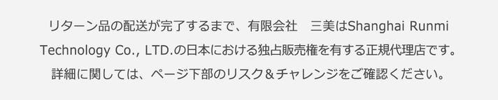 ◇本文中に記載させていただいたスケジュールは、あくまでプロジェクト公開時点の予定です。 ◇ 想定を大きく上回る応援購入を頂いた場合、製造工程の都合や配送作業に伴う止むを得ない事情等によりお届けが遅れる場合がございます。 ◇原則として、配送遅延に伴う応援購入のキャンセルはできませんが、リターン配送予定月から3カ月を超えた場合には、希望者に限りキャンセルにて対応させていただきます。 ◇ 本掲載製品の仕様やデザインは開発中のものであり変更となる場合がございます。 ◇本プロジェクトを通して想定を上回る皆様から応援購入をいただき、現在進めている環境から量産体制を更に整えることができた場合、正規販売価格が販売予定価格より下がる可能性もございます。 ◇類似品が発生する可能性があります。防ぐことができない可能性がある点、ご了承願います。 ◇返品・返金はお受けいたしかねます。 応援購入サービスの性質上、以上の注意点につきましてあらかじめご理解とご了承いただいた上で応援購入くださいますよう、宜しくお願い申し上げます。 ◇プロジェクトに関する情報 ・プロジェクトの属性:輸入商品 ・代理店によるサポート:代理店による、日本語カスタマー対応、保証等 ・プロジェクト実行者 :日本(東京都) ・製品者 :中国・上海 ・製造者 :中国・上海 ◇並行輸入品が発生する可能性があります。正規以外での個人輸入等は、完全に防ぐことができない場合がございます旨、予めご了承のほどお願いいたします。 ※並行輸入品は正規代理店による製品保証を受けることができません。 また、正規代理店を通じて購入することで、日本国内での流通に必要な各種認証の取得や、関税の適切な処理が担保されます。