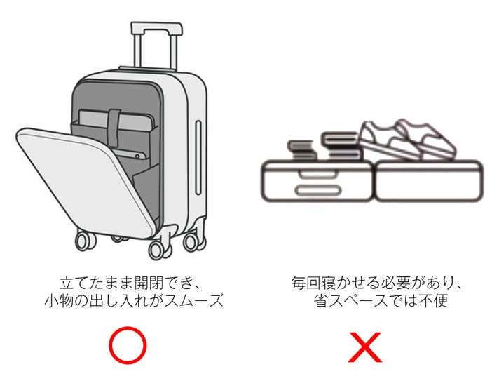 従来のスーツケースは、開けるたびに寝かせる必要があり、狭い場所では不便。